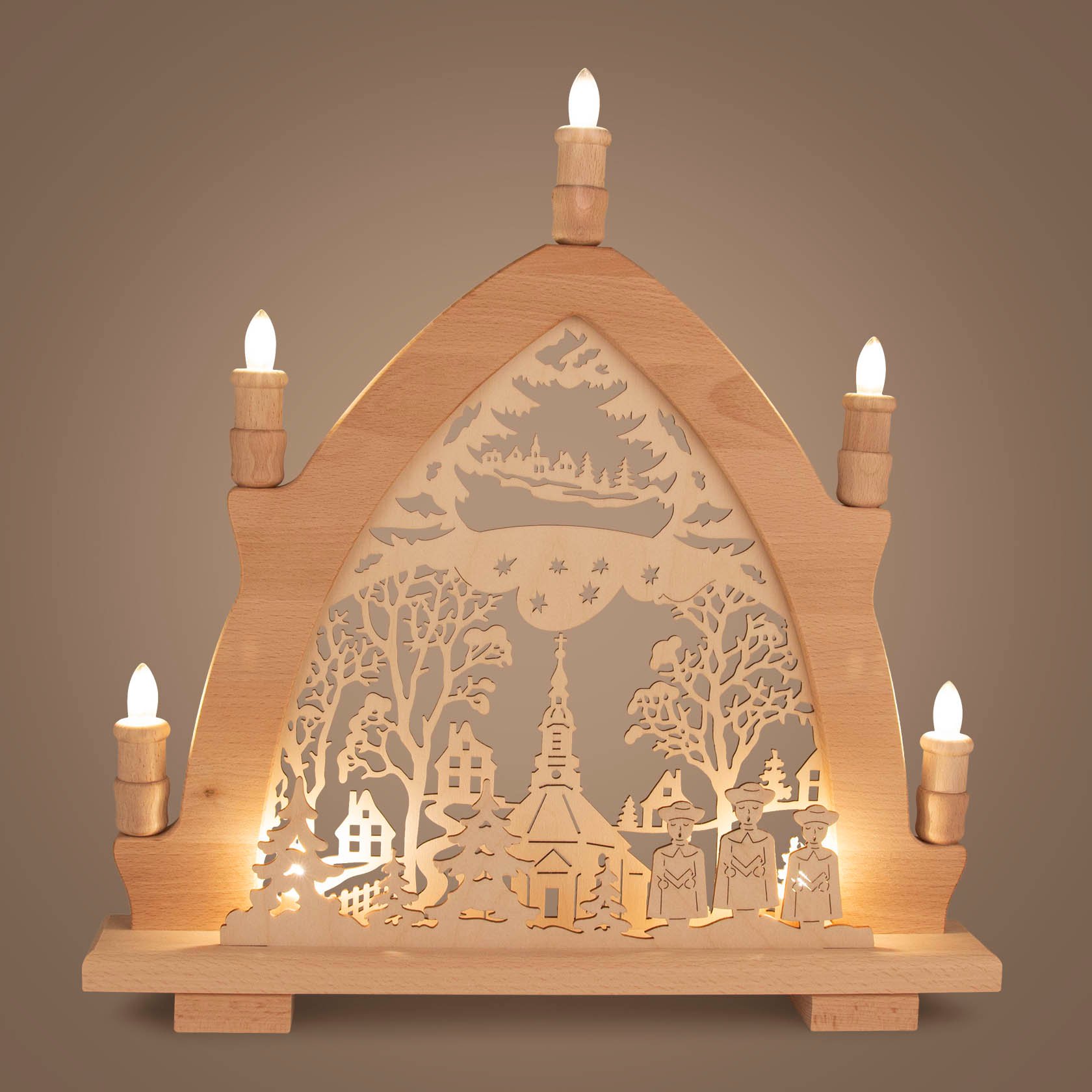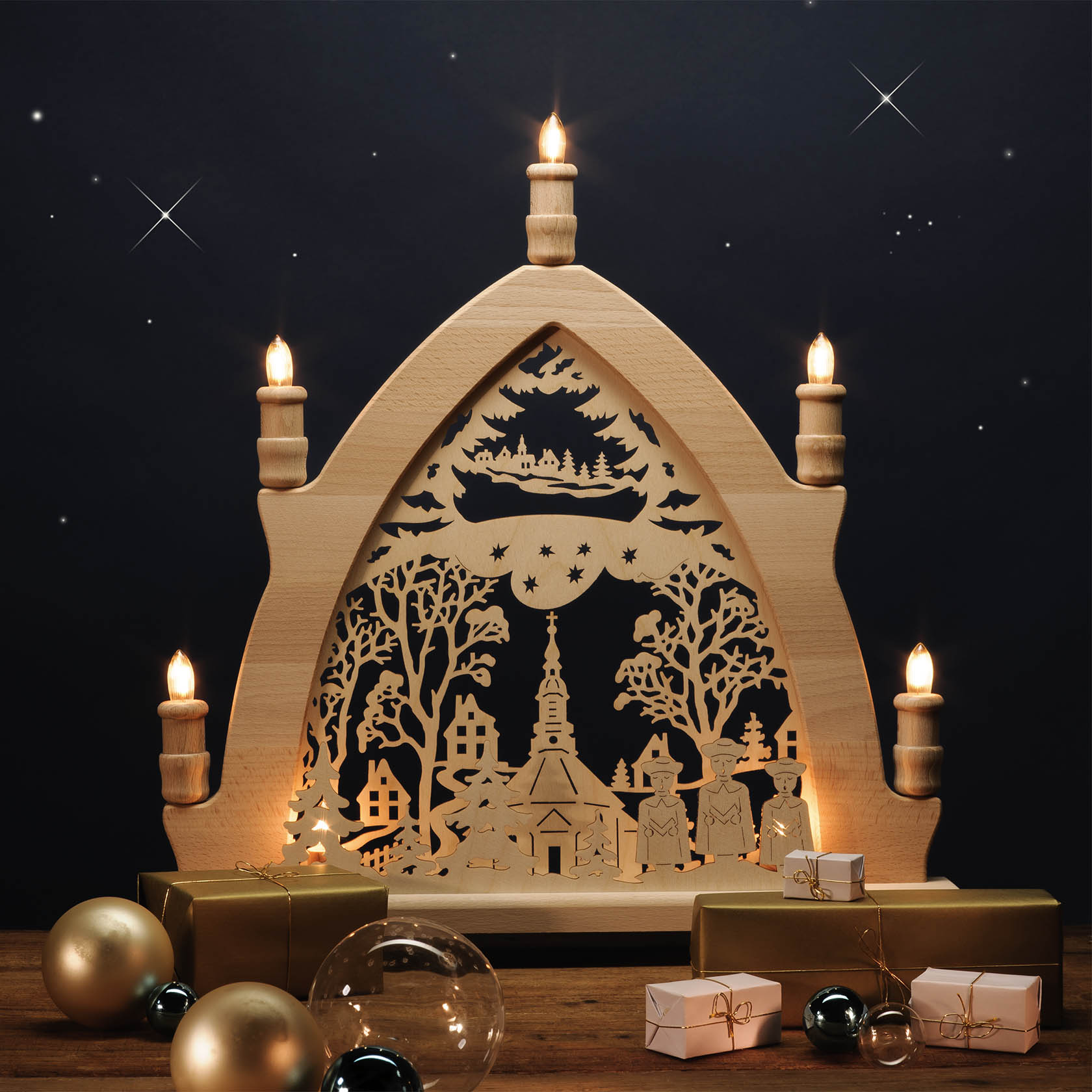 LED-Leuchterbogen Seiffener Kirche mit Innenbeleuchtung im Sockel 42x43cm