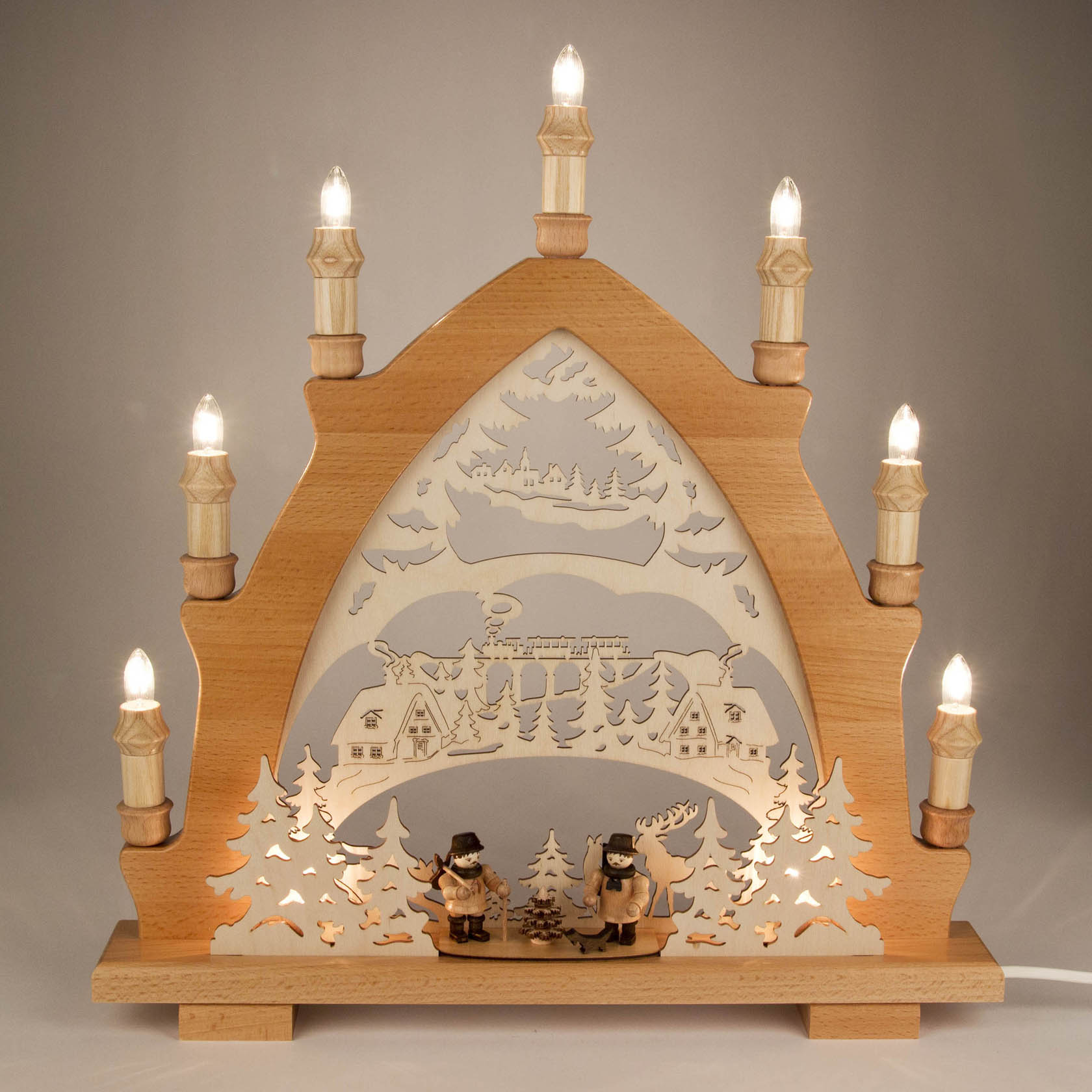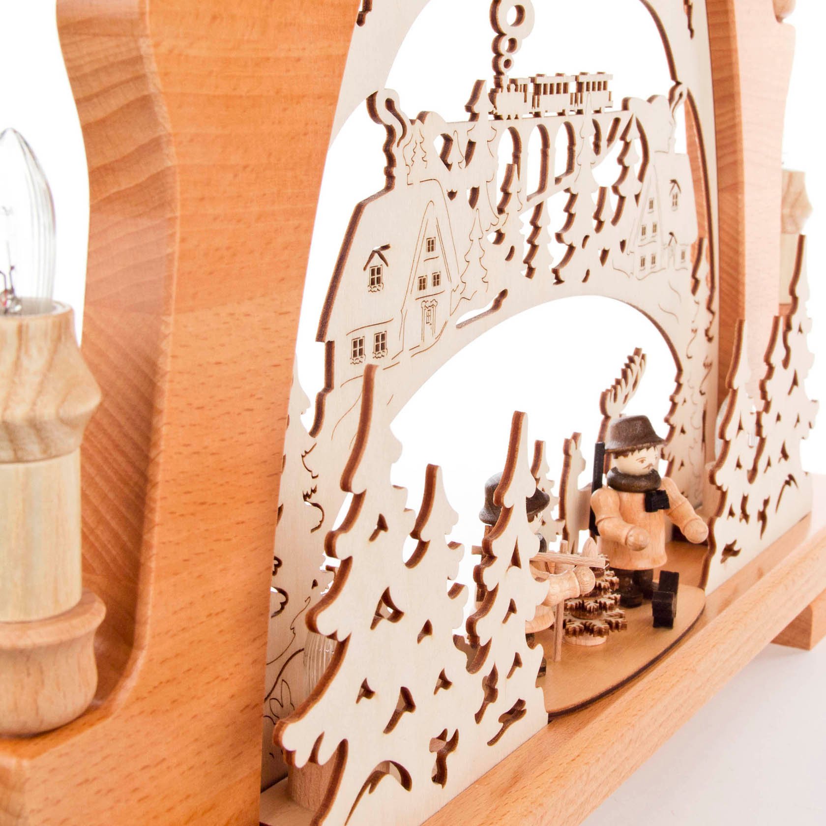 Das Fachgeschäft Volkskunst aus Seiffen präsentiert den Artikel Leuchterbogen, Motiv Wald elektrisch beleuchtet 43x42cm der Marke Dregeno