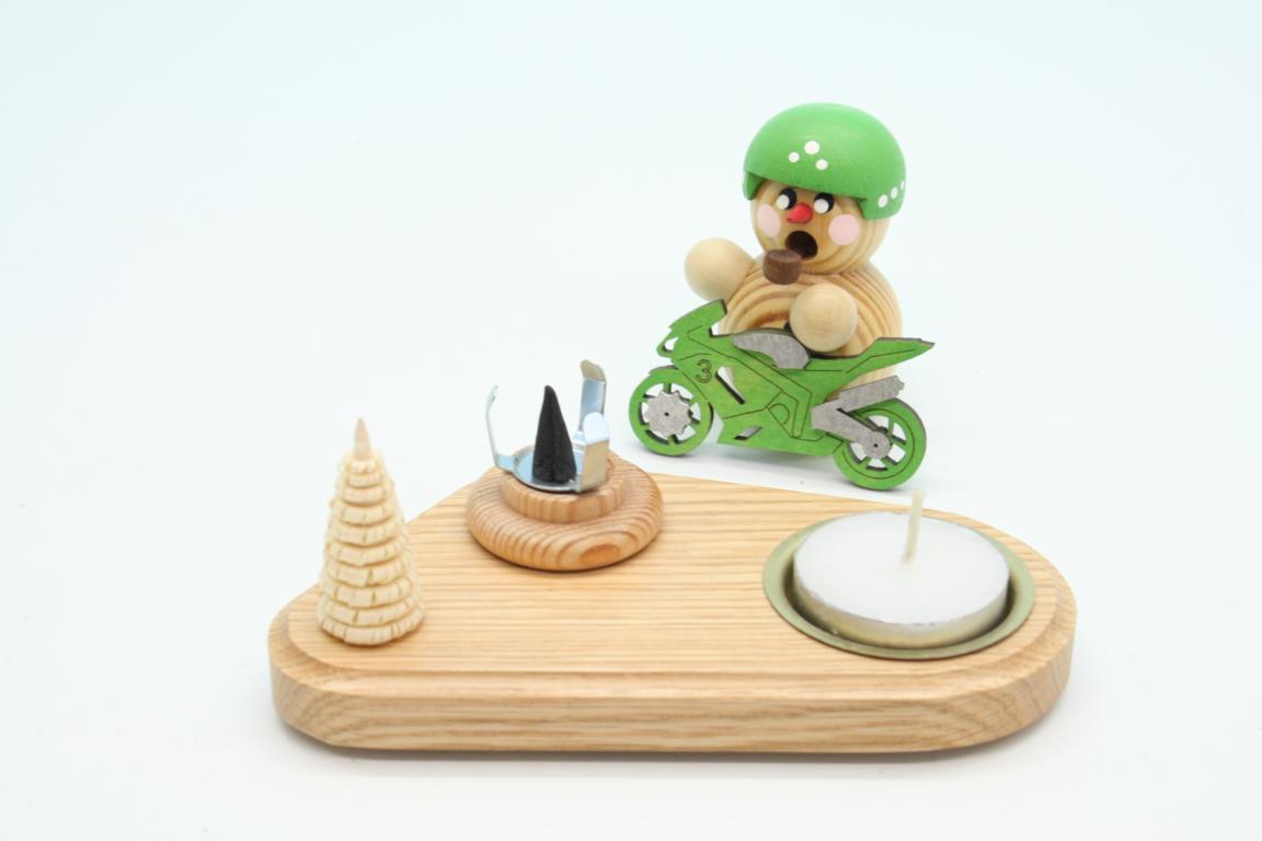 Kerzenhalter Biker natur mit grünem Bike & Schild 8cm