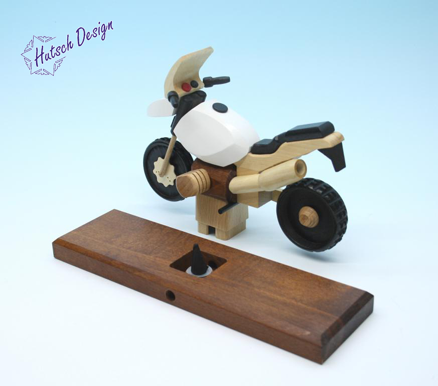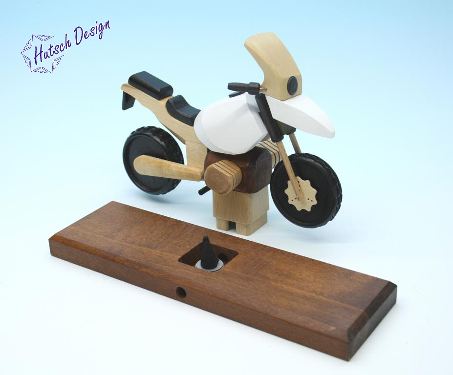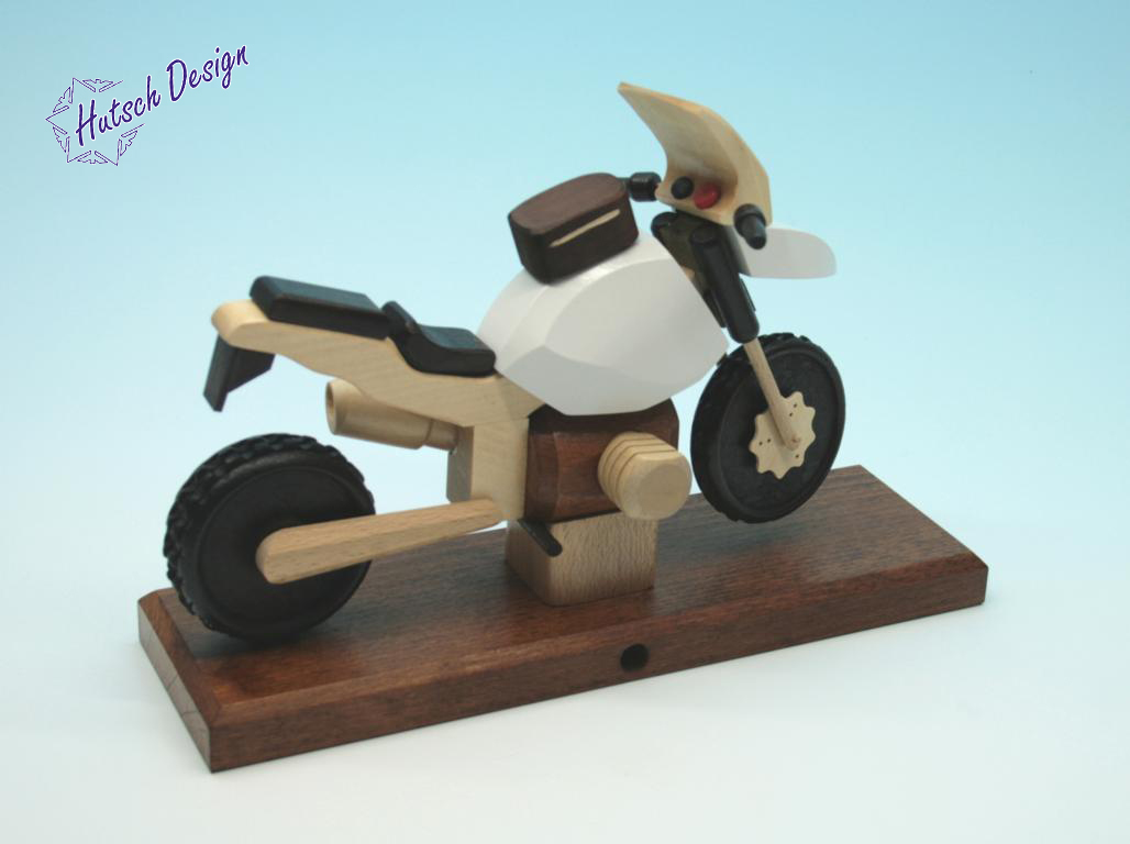 Größe: 27 x8 x 16cm ; Dieses Model ist einer BMW Boxer GS nachempfunden. Beim Training auf unseren Crossstrecke in Seiffen kamen unser Streckenwart auf die Idee, dass ich doch mal ein Motorrad machen sollte was raucht. Gesagt getan! Von da ab entwickelte ich das Crossmotorrad. Nun gibt es schon mehr als 7 verschiedene Typen. Aus eigener Produktion, hergestellt in der " kleinsten Zweiradschmiede Sachsens" mitten im Herzen des Erzgebirges, im Spielzeugdorf Seiffen. Auf dem Holzweg Richtung Highway? .... nun..., lassen wir es doch auf einen Versuch ankommen! Um Bikerträume ins Wohnzimmer zu holen, sollte man das traditionelle erzgebirgische Kunstgewerbe nicht gleich vergessen aber auch ein gewisses Maß an verrückter Kreativität besitzen.