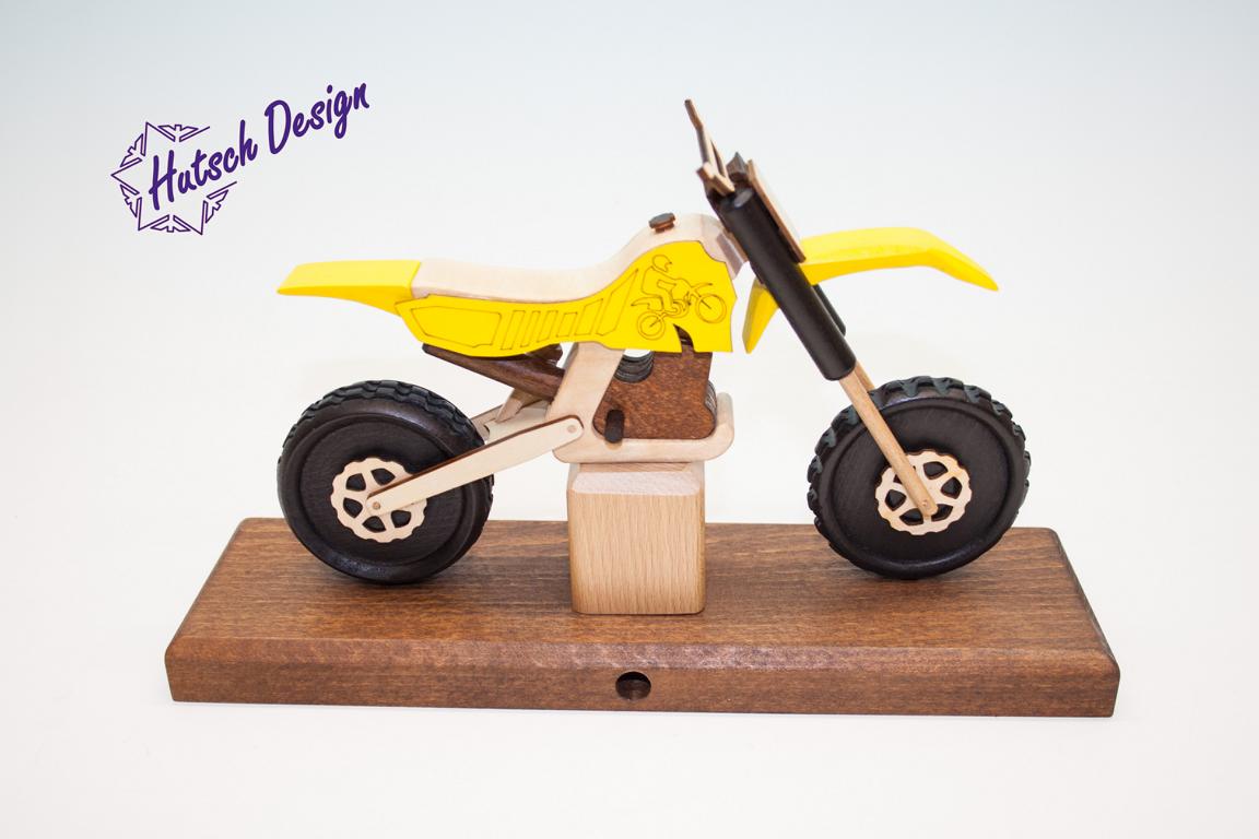 27 x8 x 16cm ; dieses Model ist einem Crossmotorrad nachempfunden. Mit Suzuki Aufschrift. Beim Training auf unseren Crossstrecke in Seiffen kam unser Streckenwart auf die Idee, dass ich doch mal ein Motorrad machen sollte was raucht. Gesagt getan! Von da ab entwickelte ich das Crossmotorrad. Nun gibt es schon mehr als 7 verschiedene Typen. Aus eigener Produktion, hergestellt in der kleinsten Zweiradschmiede Sachsens, mitten im Herzen des Erzgebirges, im Spielzeugdorf Seiffen. Auf dem Holzweg Richtung Highway? .... nun..., lassen wir es doch auf einen Versuch ankommen! Um Bikerträume ins Wohnzimmer zu holen, sollte man das traditionelle erzgebirgische Kunstgewerbe nicht gleich vergessen aber auch ein gewisses Maß an verrückter Kreativität besitzen.