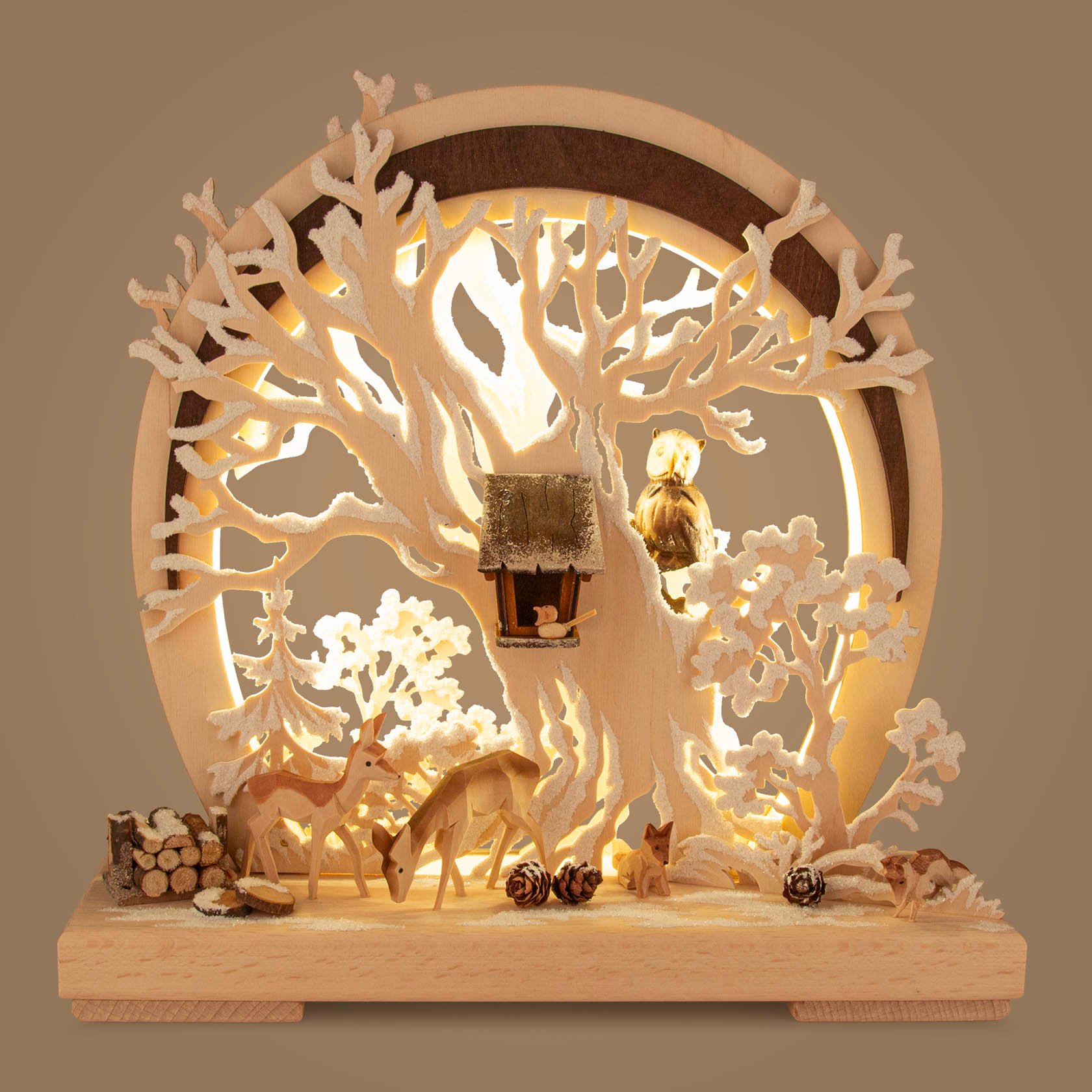 Das Fachgeschäft Volkskunst aus Seiffen präsentiert den Artikel Romantikleuchte mit Waldtieren-Raureif mit indirekter LED-Beleuchtung 29x29cm der Marke Dregeno