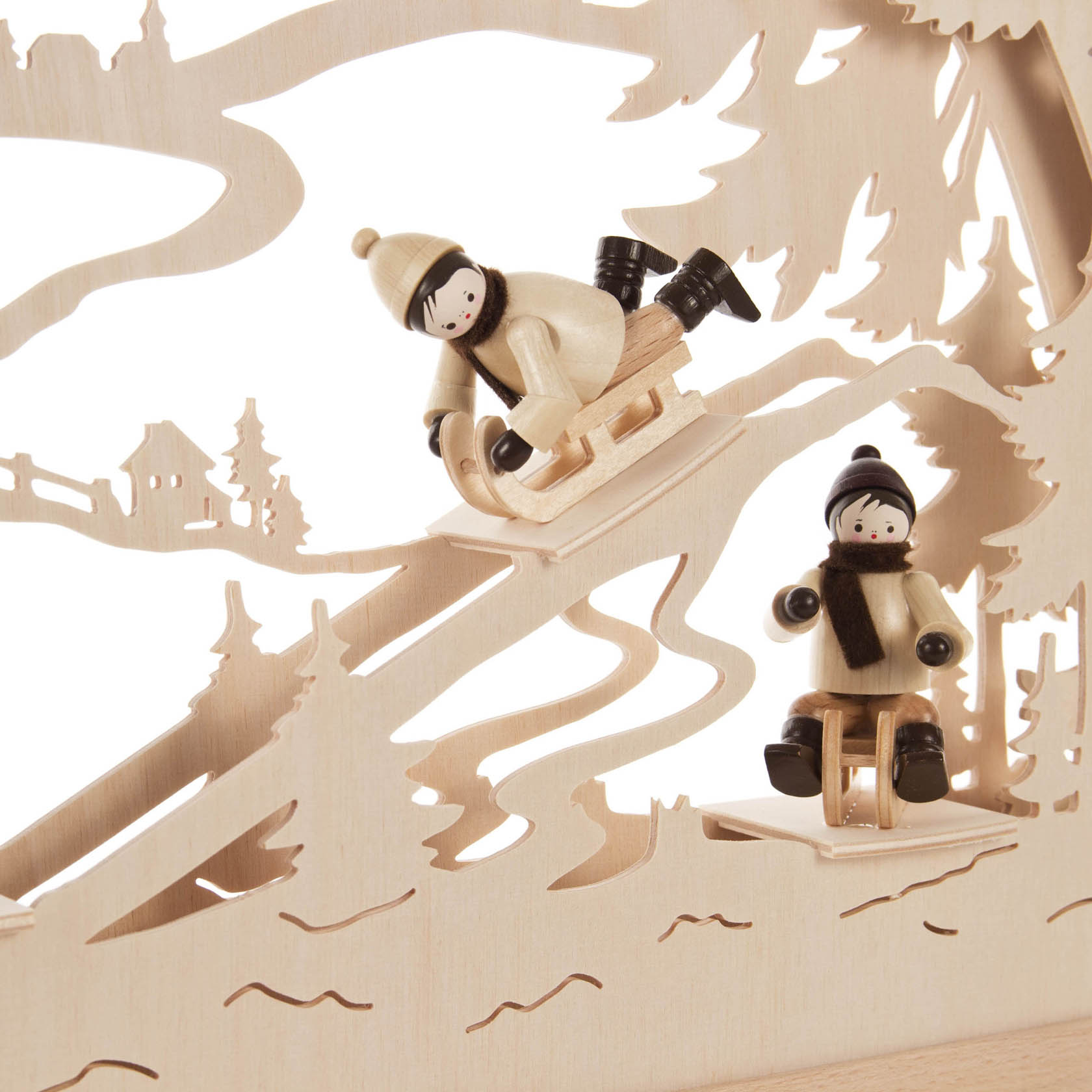 Das Fachgeschäft Volkskunst aus Seiffen präsentiert den Artikel Rundbogen Rodelberg mit Figuren elektr.Beleuchtung / LED Band 36x49cm der Marke Dregeno
