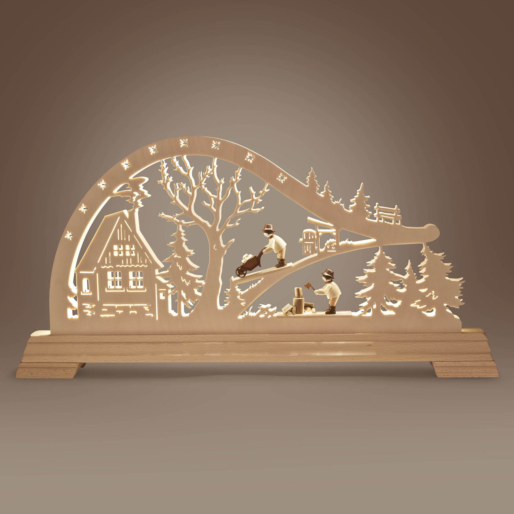 Produktinformationen "Schwibbogen Waldhütte mit Waldarbeiter und LED Beleuchtung 32x63cm"