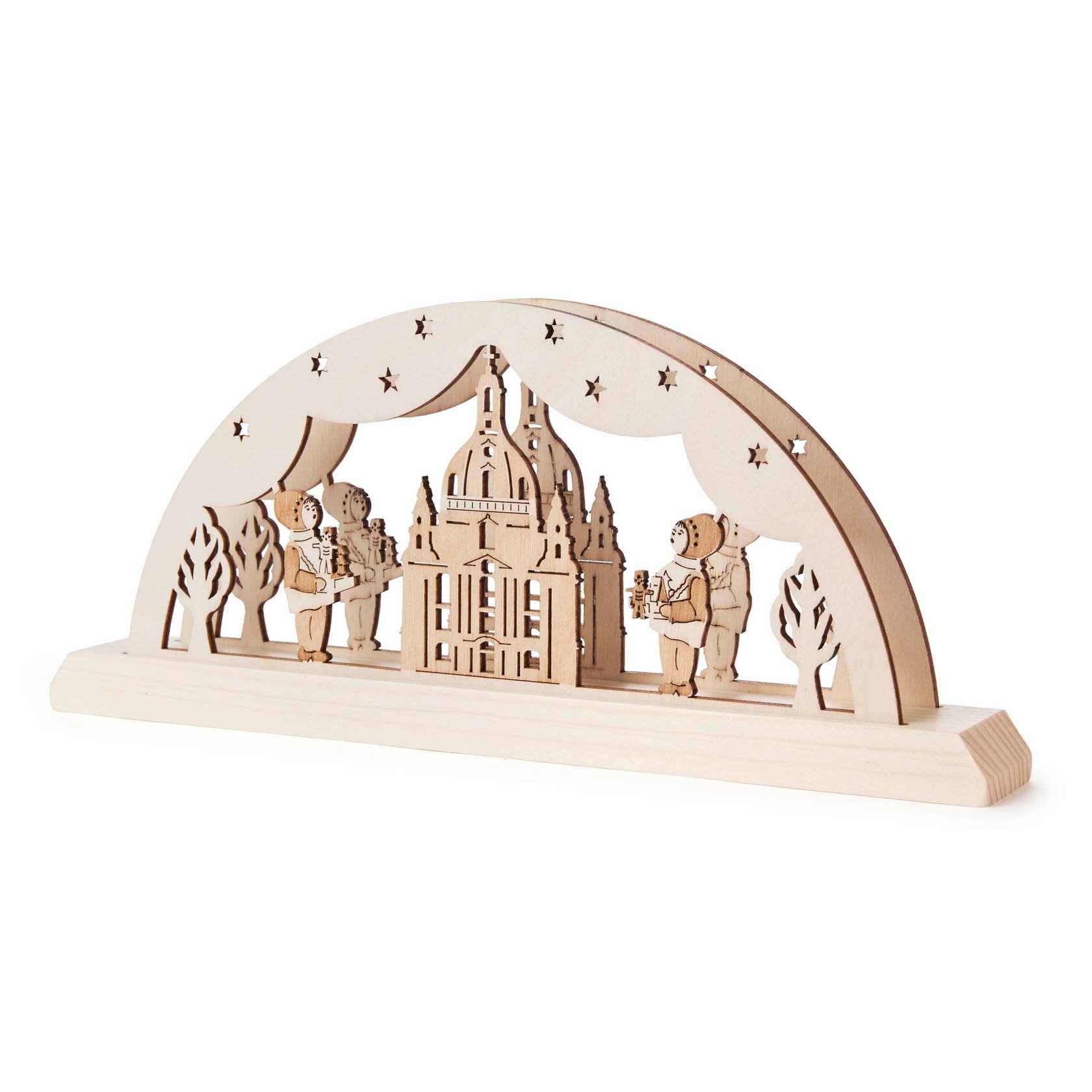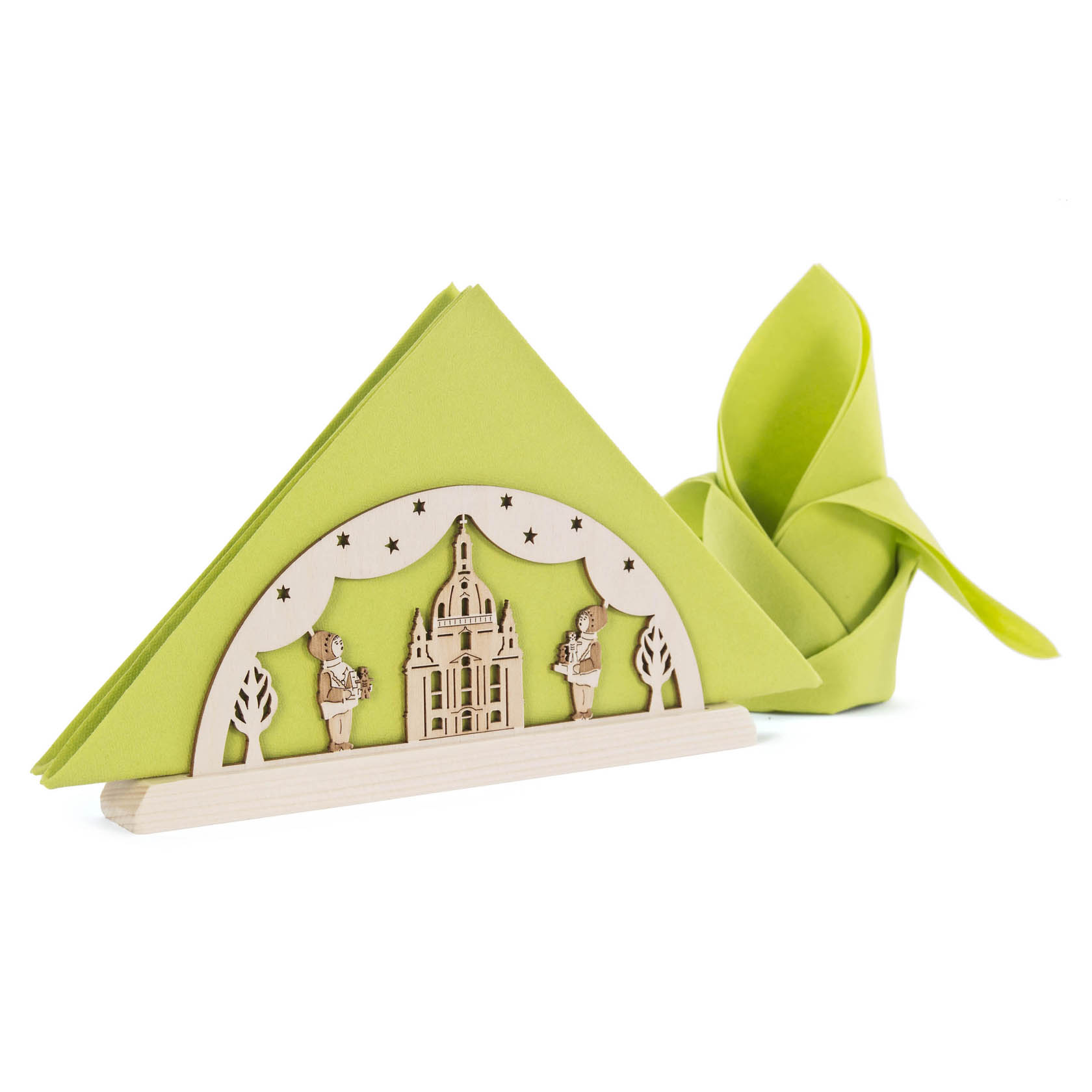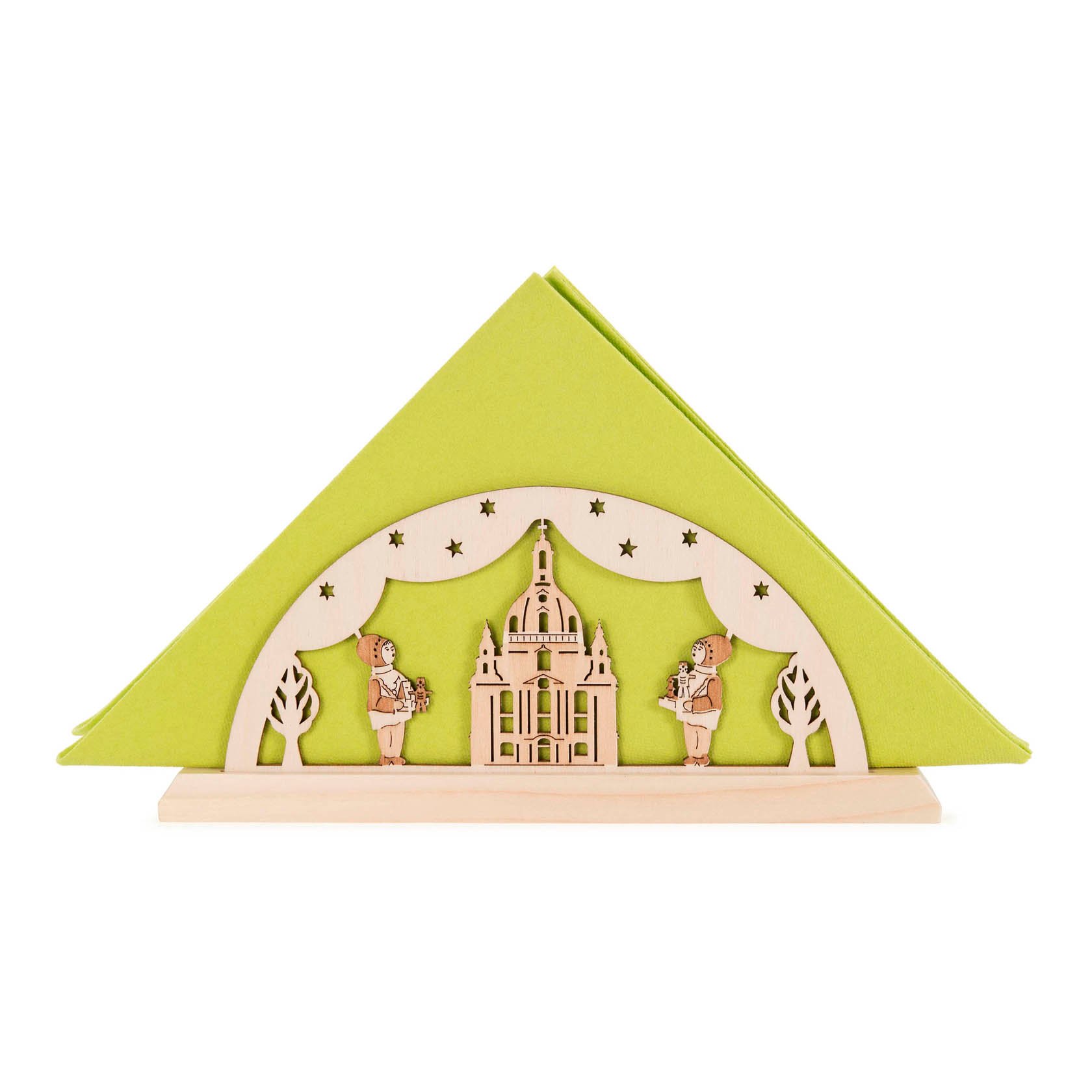 Das Fachgeschäft Volkskunst aus Seiffen präsentiert den Artikel Serviettenständer mit Dresdner Frauenkirche 23x10cm der Marke Dregeno